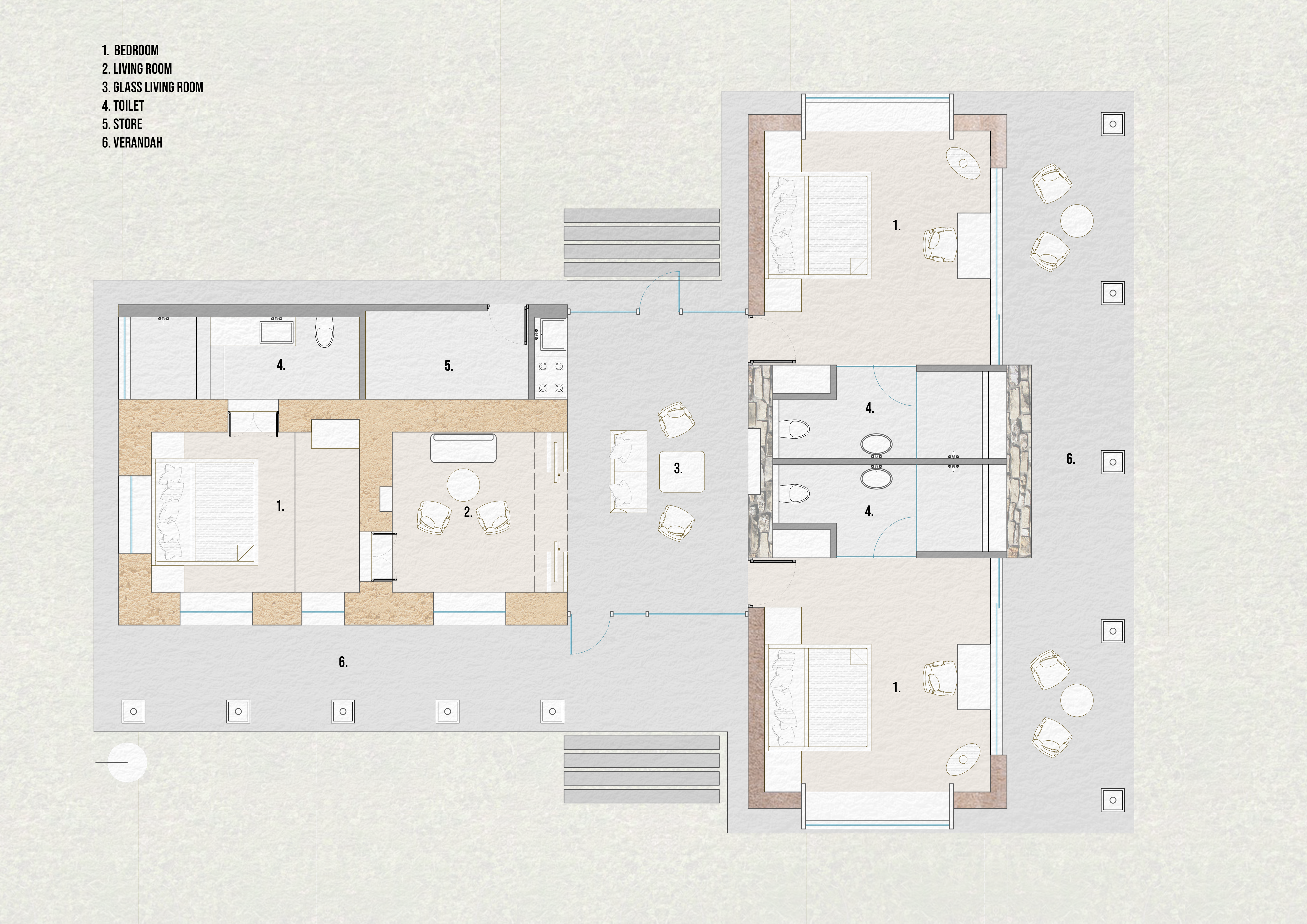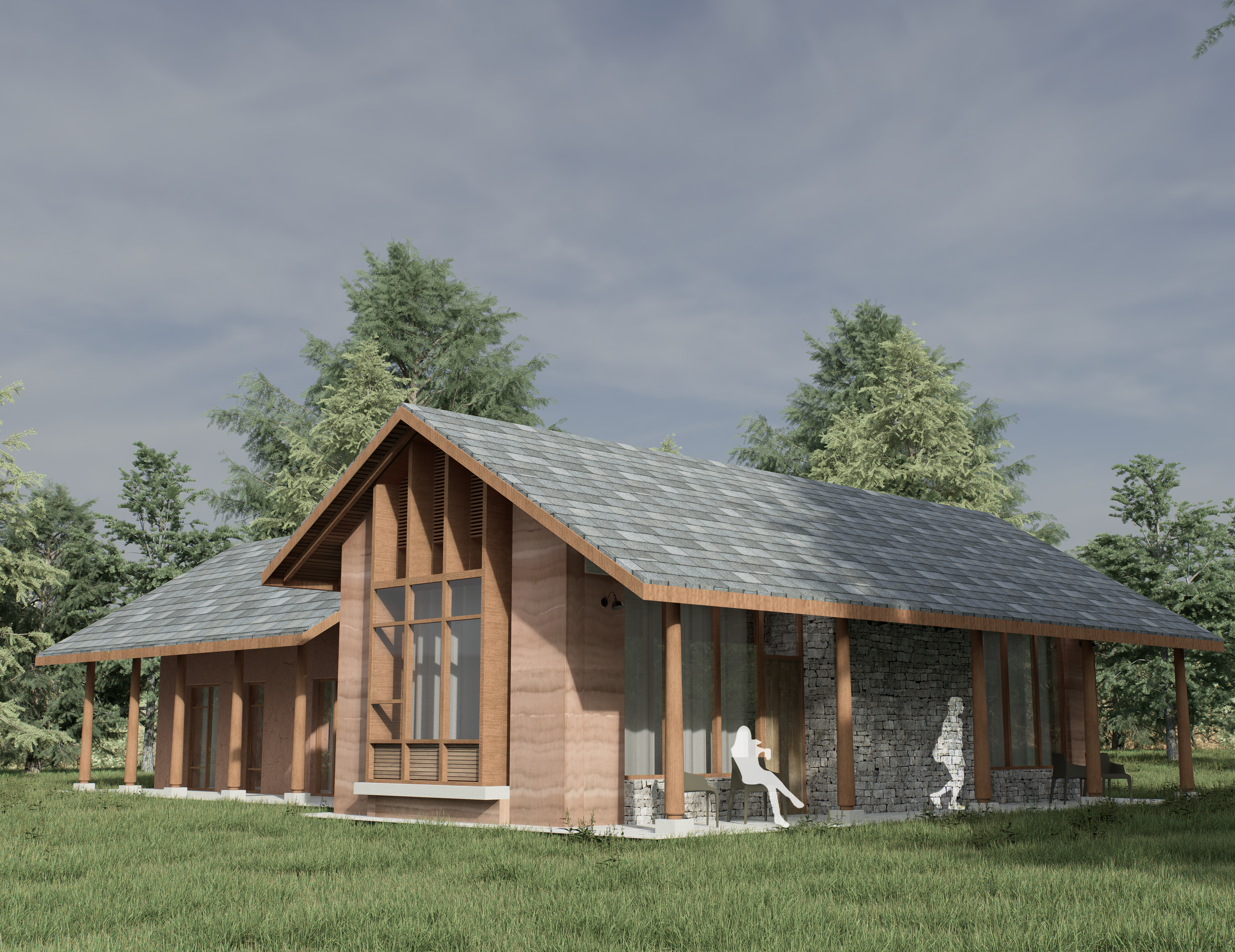 The existing cottage houses a bedroom, a covered verandah, and a living room, with a newly added bathroom on the east side. The living area expands with a glass vestibule, introducing ample natural light—something the cottage previously lacked—while also serving as the main entrance to the homestay.